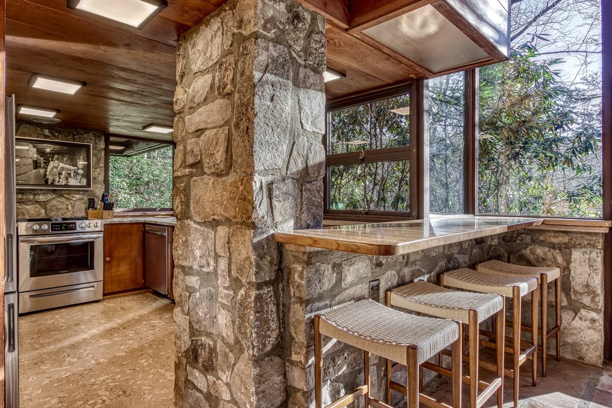 Rara vez es una casa de importancia arquitectónica histórica disponible para su uso como alquiler vacacional en la mayoría de los destinos, y eso es particularmente cierto en Gatlinburg y Pittman Center. Diseñada por Bruce McCarty, conocido por muchos edificios públicos y privados en Knoxville, Tennessee, esta joya de un hogar muestra su pasión por integrar el diseño moderno con el paisaje natural. Usando materiales locales, la casa parece haber sido esculpida desde el sitio usando piedra, madera y vidrio.