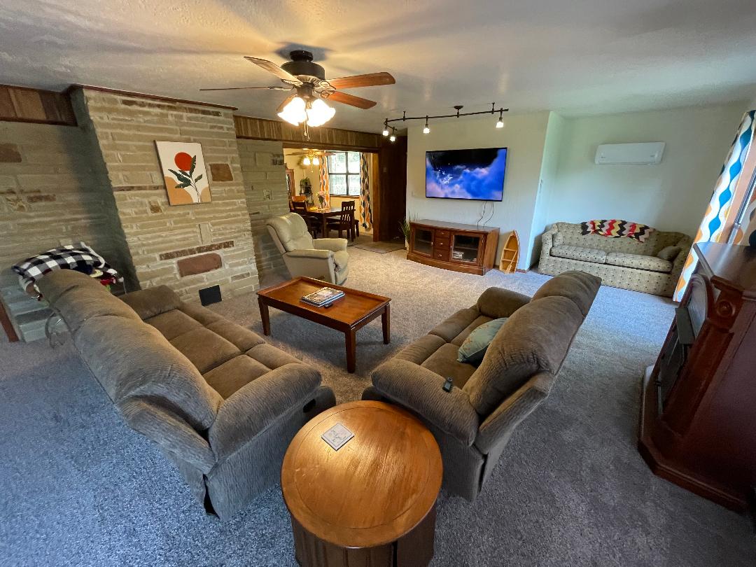 ¡Acogedor refugio actualizado de 2 dormitorios/1 baño con impresionantes vistas al amanecer orientadas al este! Capacidad para 5 personas con suite tamaño king, dormitorio tamaño queen y futón de tamaño completo. Disfruta de televisores inteligentes, seccionales con chimenea eléctrica, comedor para cuatro personas y espacio de trabajo dedicado. Relájate al aire libre en la espaciosa terraza, columpio de porche de cedro, hamacas o alrededor de la chimenea con sillas Adirondack, perfectas para una escapada familiar o romántica.