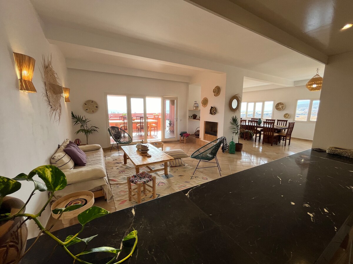 You’ll love our Berber-style decor of this charming place to stay. Located a walkway from the beach (3 min walking), in the small town of Taghazout, our brand new guest house has a living room, a well-equipped kitchen, 9 comfortable rooms with private bathrooms (27beds in total), yoga shala, and two wonderful terraces with spectacular views. It’s a perfect place for friends and families to relax and discover the region, especially for those who like adventures of every kind.