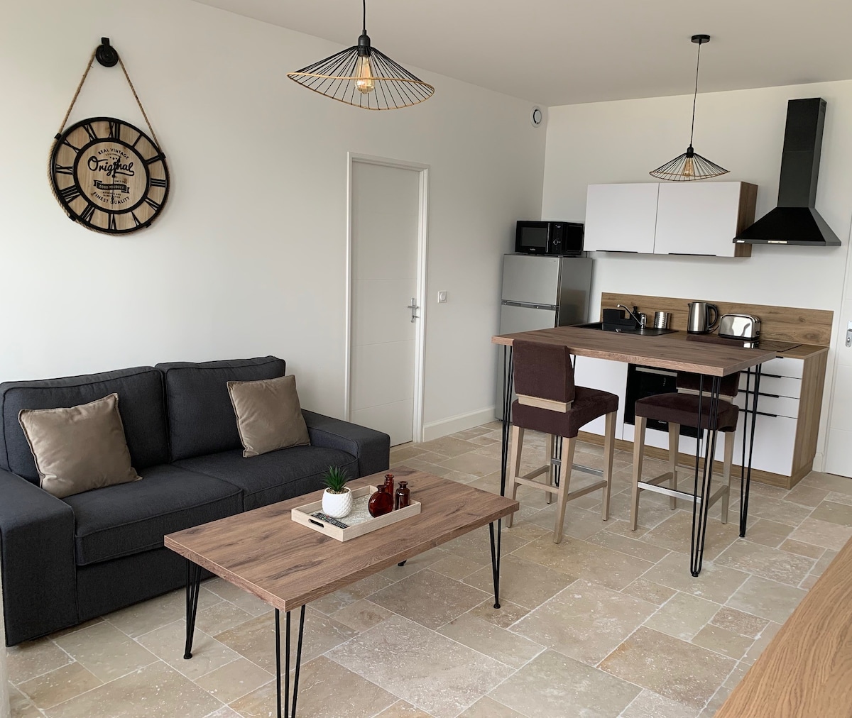 Situado en un patio compartido con nuestra casa, este apartamento es independiente y tranquilo, alejado de la carretera. Consta de una entrada que da servicio al inodoro y a la habitación principal. Esta habitación cuenta con una sala de estar y cocina abierta totalmente equipada y con todos los utensilios de cocina a tu disposición. Por último, disfrutará de una habitación con baño. El apartamento está orientado al sur para una buena luminosidad durante todo el día y tiene persianas para noches tranquilas.