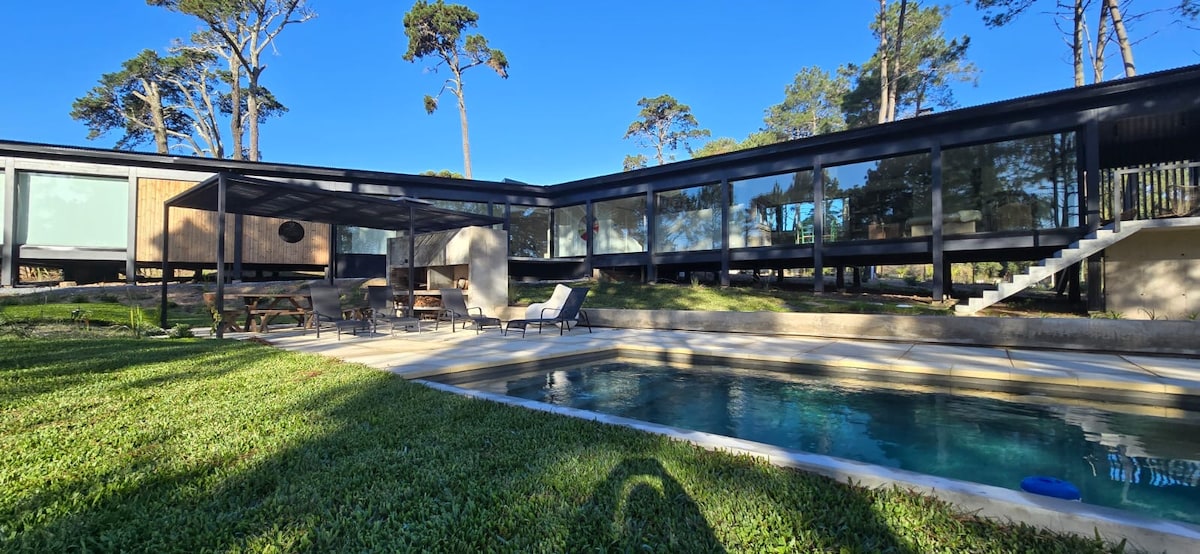 Moderna casa de diseño contemporáneo. Muy espaciosa, amplios ambientes iluminados, hermosas vistas, cocina de concepto abierto, barbacoa techada integrada. Cuenta con tres amplios dormitorios, tres baños completos, uno en suite con vestidor, totalmente equipada para ocho personas. A pasos de la hermosa playa mansa en Pinares de Punta del Este.