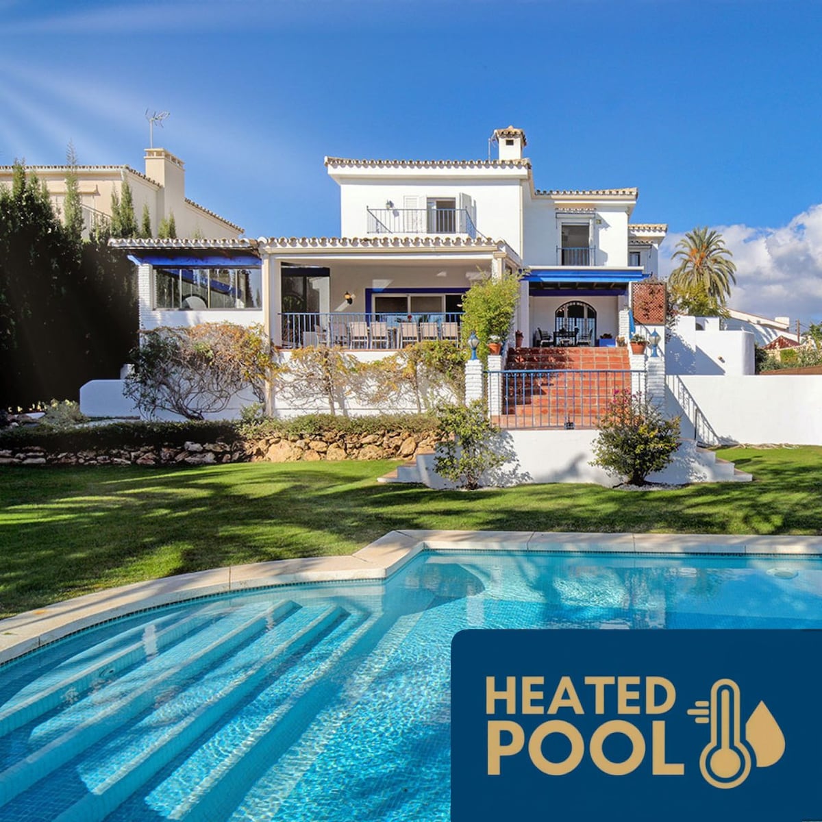 Luxury villa just 4 min walk to beach, heated pool