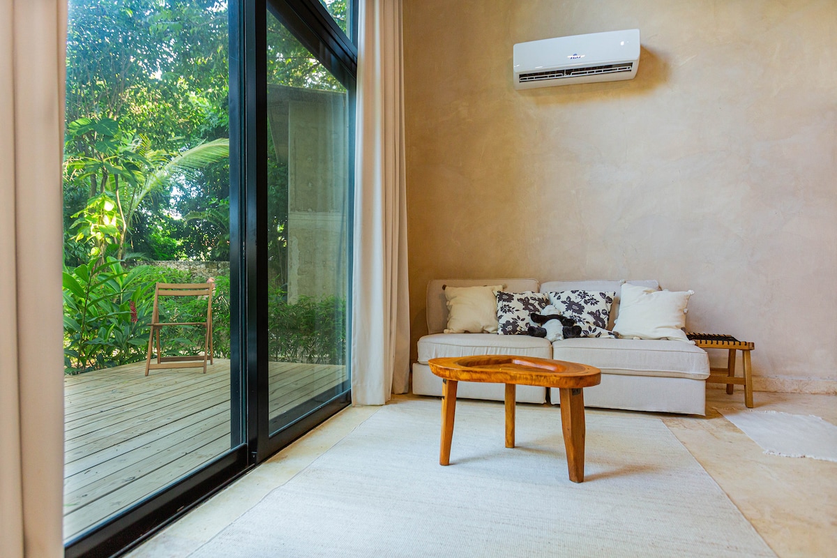 ¡10 minutos caminando a la playa! Lugar perfecto para surfers, amigos o parejas. Todo lo que necesitas: Perfectamente limpio, WiFi, toallas de baño, cocina bien equipada y Aire Acondicionado en habitación y sala. Con seguridad y planta eléctrica 24hs. Disfruta despertando escuchando la naturaleza, de camino a surfear compra unos croissants de chocolate, practica yoga, un baño relajante en la piscina y aun no es mediodía, ¿ya escuchas las olas?