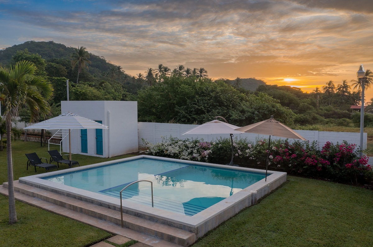 Bienvenido a Mangomar, un acogedor refugio frente al mar en una espaciosa propiedad de medio acre en la hermosa y poco conocida playa de Sihuapilapa. Disfruta de una gran piscina, bar de playa, ping-pong, parque infantil y acceso directo a una playa tranquila y segura. La casa ofrece 4 dormitorios con 4 baños completos, aire acondicionado en todas las habitaciones, WiFi, cocina completa, caja fuerte, barbacoa argentina y paneles solares ecológicos. Hay masajes y una cuna disponibles previa solicitud. Tu escapada a la playa escondida te espera. 🌴✨