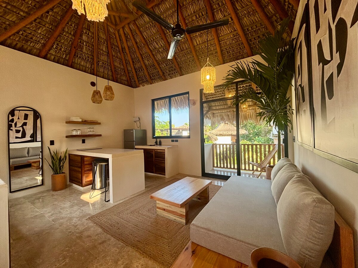 Relájate en esta escapada única y tranquila. Disfruta de este departamento acogedor para 2 personas, a pocos minutos caminando de la playa y de la calle principal. Ubicado en el 2º piso, cuenta con una habitación con cama King, aire acondicionado, TV y un espacio de trabajo. La sala abierta, ubicada bajo una palapa, conecta directamente con la alberquita que ofrece una pequeña vista al mar, además de Internet Starlink y una cocina equipada. Perfecto para descansar después de un día en el mar.