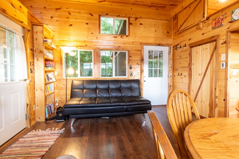 Located on MIllsap Farm which is home to one of Springfield's favorite summer activities; Thursday Pizza Club. Come stay in our Tiny Turtle countryside cabin and get a taste of farm life on this small organic veggie farm. Take a walk in flower patch, visit the chickens, feed your scraps to the pigs, throw the ball for the dogs, be entertained by the farm happenings. Our tiny home is well designed and can easily host a family. The farm stand is stocked and ready for you just outside your door.