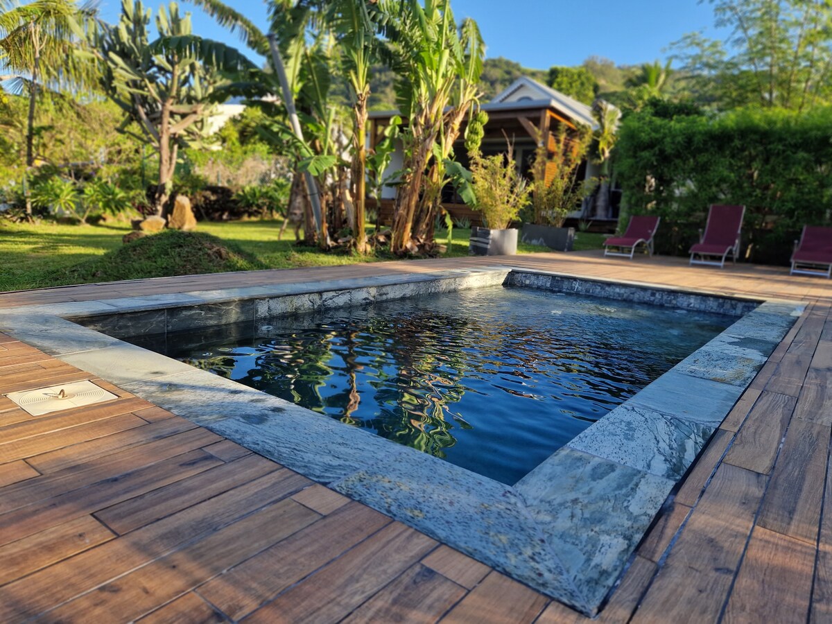 La Villa Galet Bleu, situada en el corazón del Domaine du Cap Sauvage, permite alojar hasta 4 personas. Te transporta a su universo marino. Romántico e íntimo, te embriaga por la belleza de la naturaleza de los alrededores. Impresionante, durante el invierno austral, te coloca en primera fila para saludar a las ballenas. El punto culminante del espectáculo: ¡su bañera exterior frente al Océano Índico! Descubre la, en el corazón de un complejo de 5 villas que rodean una piscina de piedra natural.