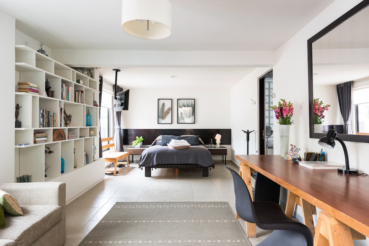 Loft abierto, gran ubicación en uno de los barrios más bonitos de la Ciudad de México, recién renovado y totalmente amueblado, cerca del metro, parques, museo y restaurantes. -Tomamos las medidas necesarias para tener un espacio limpio y confortable. -Al llegar encontrará un kit de desinfección. -Guardia del edificio 24 hrs, Roku tv, puedes usar las apps de la smart tv. -Agradable sala de estar, cocina totalmente equipada, sofá cama, cama queen size. -Excelente lugar para trabajar cómodamente.
