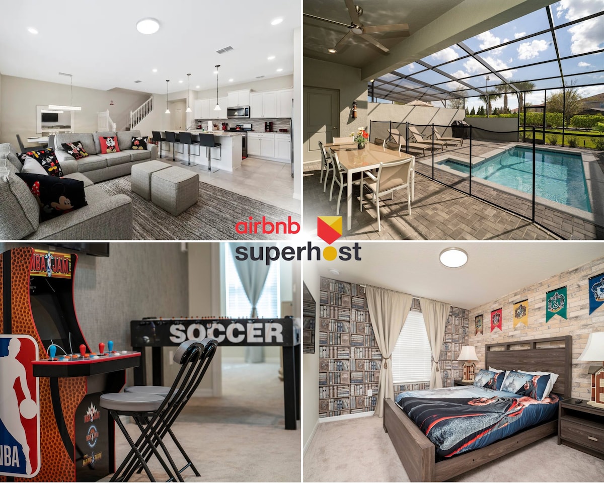 Hermosa villa de 5 dormitorios y 3 baños en un complejo cerrado a 20 minutos de Disney con wifi gratuito - instalaciones del complejo gratuitas. Capacidad para 10 personas Piscina privada con TV al aire libre para noches de cine en la piscina (valla de seguridad extraíble): se puede calentar por $50 por noche. Cocina exterior con nevera/plancha/estufa/parrilla GRATIS. Sala de cine de 8 asientos con masaje reclinable y asientos térmicos/máquina de palomitas de maíz/juegos de arcade Televisores inteligentes en todas las habitaciones, incluido uno de 85" en el salón Cocina totalmente equipada con una amplia gama de electrodomésticos de cocina Cuarto de lavandería