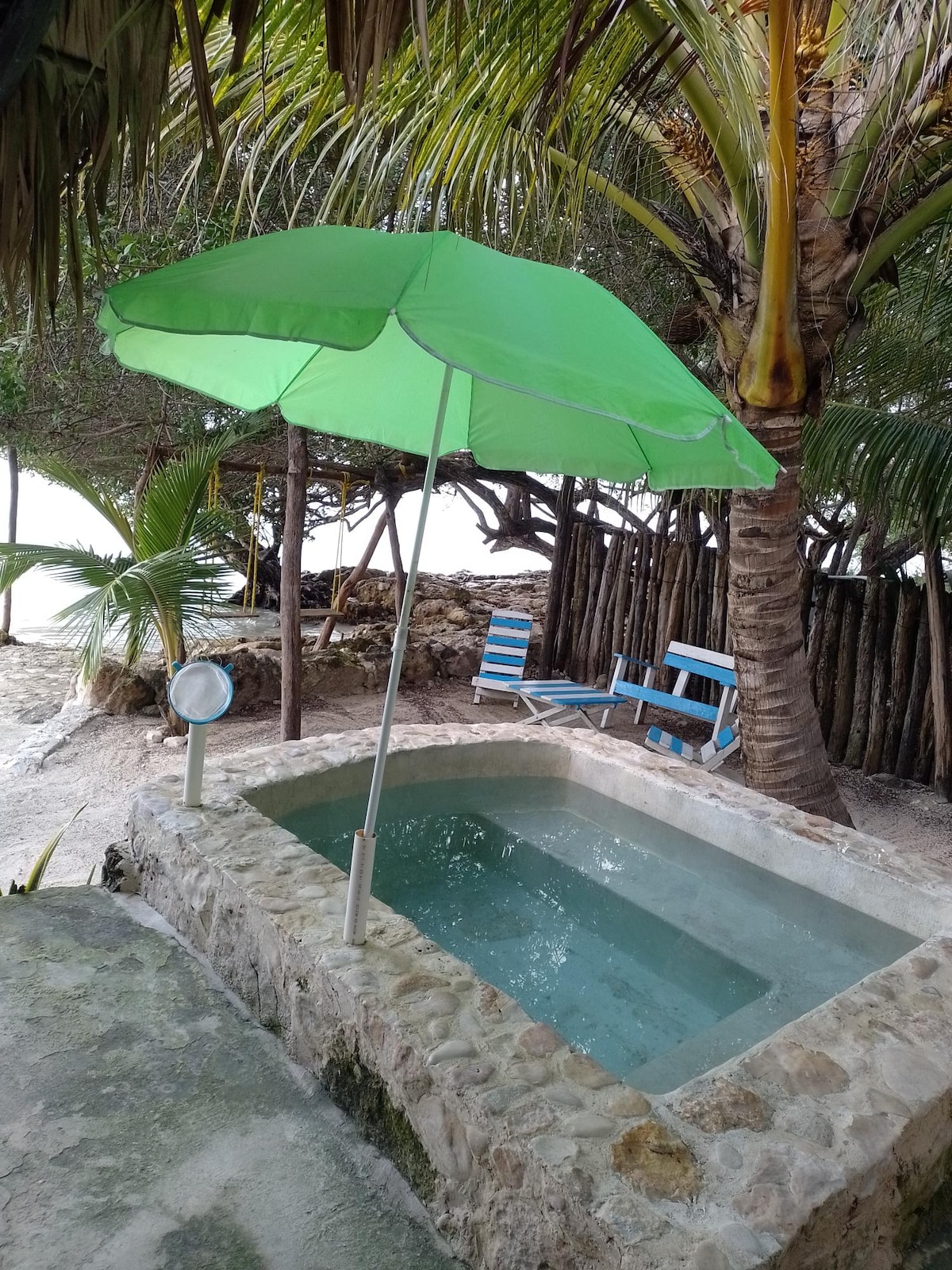 Es un alojamiento completo con alberca privada. Propiedad ubicada a unos pasos de la famosa calle 59, llena de cafés, restaurantes y bares. La decoración es colonial, la sala con sofá, tv de 50" con Netflix, Wi Fi, comedor para 6 personas, cocina con estufa de inducción magnética , refrigerador, horno de microhondas, 1 dormitorio con cama king size, TV de 32”, 1 aire acondicionado, ropero, baño con agua caliente y terraza con alberca. El Aire acondicionado solo hay en la habitación .