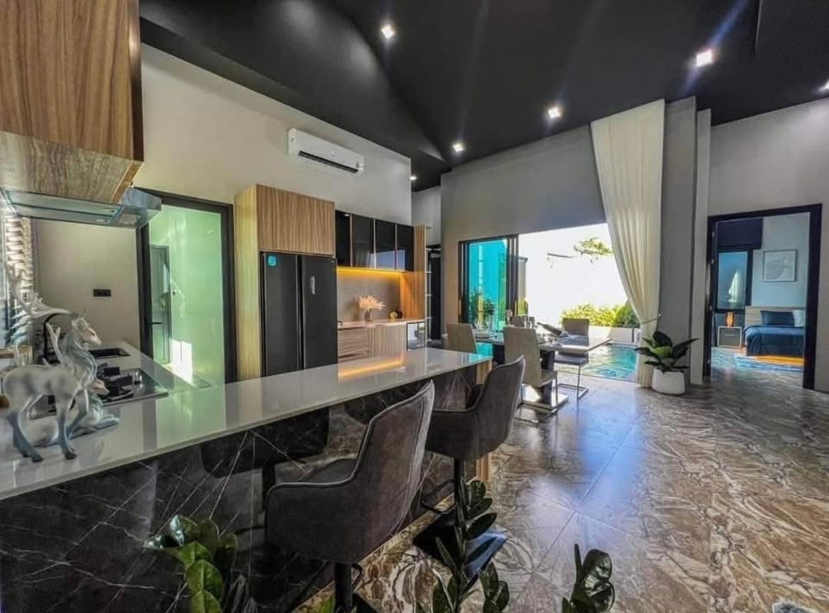 Lujosa villa con piscina privada equipada con sistema de jacuzzi. Esta moderna villa de estilo nórdico es muy privada con un garaje eléctrico totalmente cerrado que garantiza tu privacidad. Acceso rápido a todos los mejores centros comerciales y a solo 10 minutos de la playa de Pattaya. Esta villa tiene 4 dormitorios y 4 baños y una gran sala de estar con una altura de techo de hasta 6 metros que te da una sensación muy espaciosa y no abarrotada. La villa puede albergar 2 autos en el interior y 1 en el frente.