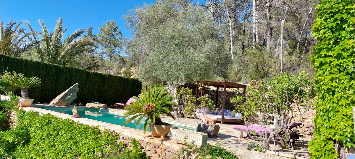 Encantadora villa de estilo boutique enclavada en un romántico jardín verde con árboles viejos y flores. Con sus terrazas, zonas de relax y una pequeña piscina privada encantadora, la propiedad ofrece un gran espacio y privacidad para 8 a 9 huéspedes. Los 4 dormitorios tienen aire acondicionado. Internet: ¡fibra óptica de alta velocidad! A 6 minutos a pie se llega a la hermosa playa de arena de Cala Llonga. Restaurantes, supermercados, tiendas y parada de taxis a solo 4 minutos a pie. A Ibiza Golf o Santa Eularia se tarda 5 minutos en coche; a la ciudad de Ibiza se tarda 12 minutos.