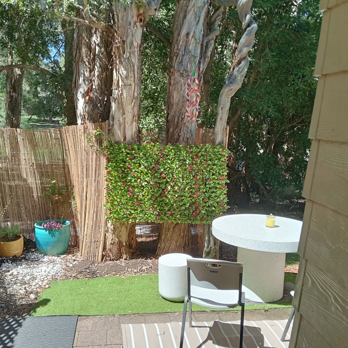 Amplia suite de invitados independiente con una sala de estar/comedor/cocina combinada, dormitorio principal con baño privado, segundo dormitorio y segundo baño, patio y lavandería adjunta. Una vista al jardín desde la sala de estar. Se proporcionan sábanas y toallas, y las camas se preparan antes de tu llegada. Fácil acceso desde los espacios delanteros del auto. Wifi gratuito y Netflix. A cinco minutos en auto de la playa, el campo de golf y las tiendas. El Parque Nacional Myall Lakes está a 5 km al norte. Hawks Nest está a 50 km de Raymond Terrace.