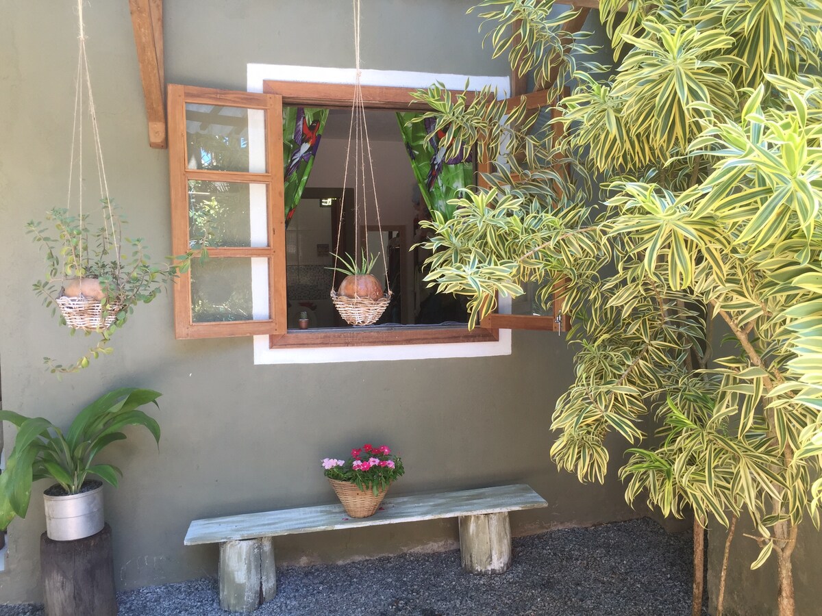 Espacio espacioso, cómodo y muy bien ventilado en la planta superior, con vistas al bosque nativo, cerca de la playa y del centro de Arraial d Ajuda. Con ventilador de techo, minibar, placa de cocina y utensilios de cocina. Ofrecemos toallas, sábanas y artículos de tocador. Nuestro patio trasero está rodeado de bosque nativo y con muchos animales sueltos que hacen felices a los niños y a muchos adultos. La Rua do Mucugê está a solo 900 metros y la playa más cercana es la de los Pescadores, a solo 3 cuadras.