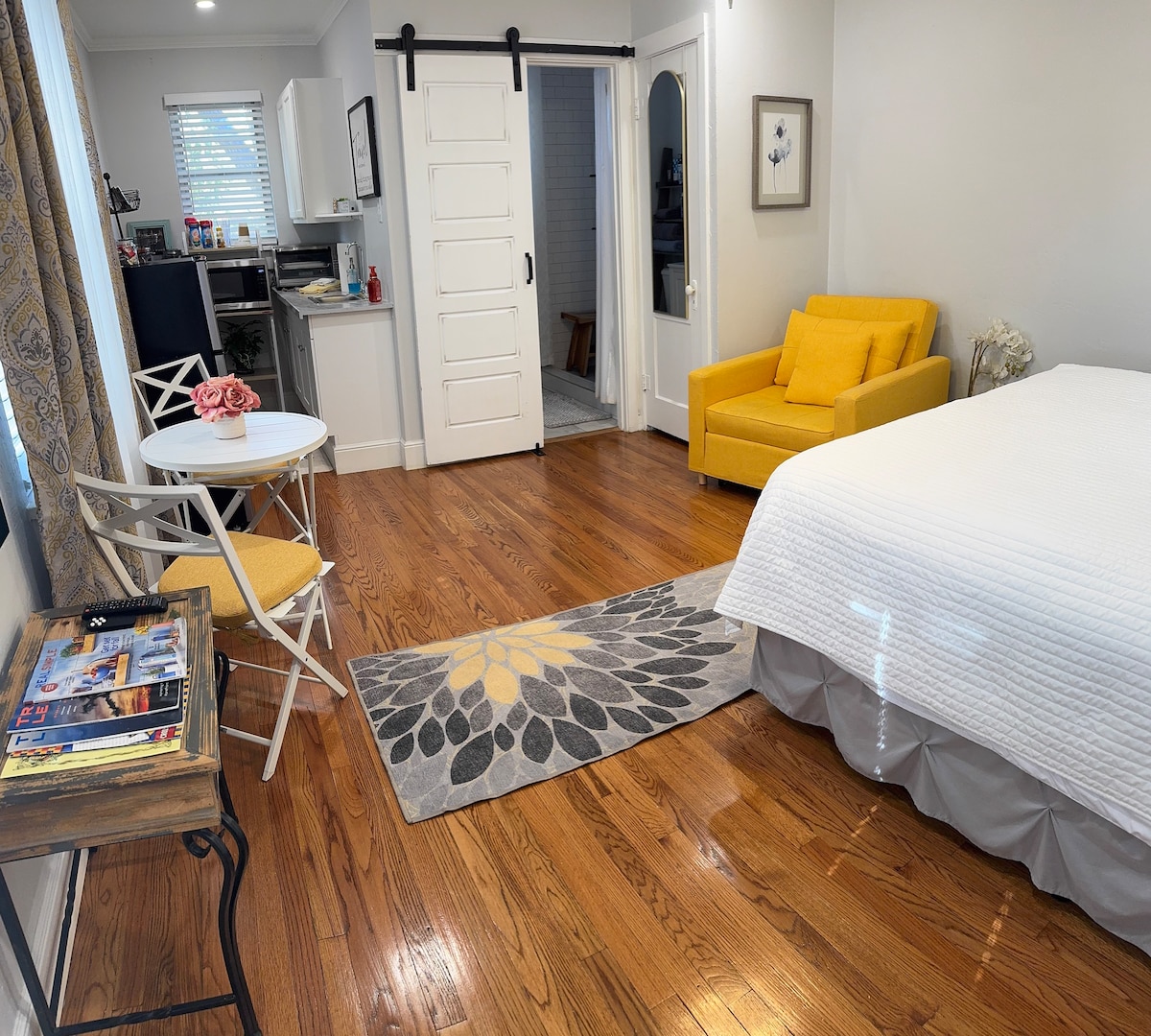 Mid-century retro charm. Fully stocked w/anything u might need. Just bring your clothes! Heat & a/c. Street parking w/security cameras. Qn-size PURPLE mattress. Pack n Play avl upon REQUEST ($15 fee) Fridge, microwave, toaster, toaster oven, 2 burner elect cooktop, ice maker, coffee/tea station, Smart TV Iron & board, hangers, luggage rack, box fan. Table & chairs make a great work station Ext security cameras monitor front of main house (incl street where u will park) & front door of studio)