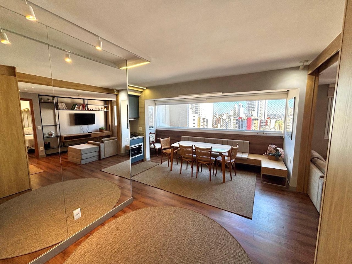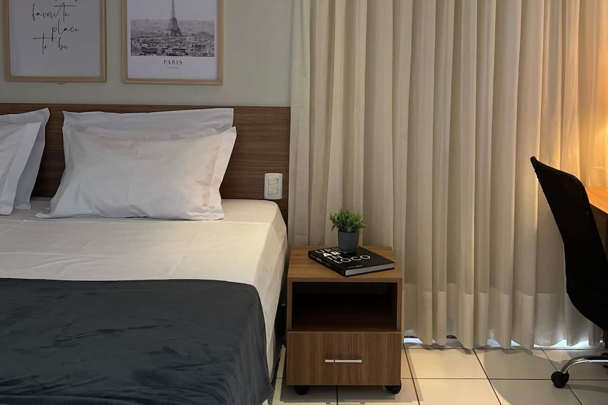 Abraza la simplicidad en este lugar tranquilo y bien ubicado en la mejor ubicación de Goiânia, frente a la plaza del sol, cerca de restaurantes, bares, supermercados. Departamento completo con comedor, cocina completa, televisor inteligente con Samsung plus, WiFi, Alexa, aire acondicionado, balcón. Todo lo que necesitas para una estadía súper cómoda, con garaje y recepción las 24 horas.