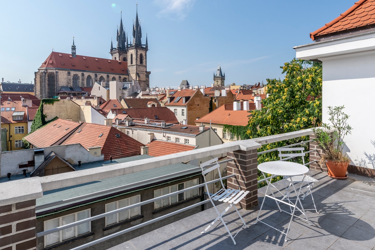 Cathedral view from bed – especially at night. Quiet apt with courtyard orientation in heart historic centre features acoustic glazing for a restful night, private balcony for morning coffee and evening relax. Shared terrace with panoramic views . High-speed Wi-Fi for work. Steps from Old Town Square, Charles Bridge, the Jewish Quarter and Pařížská with the city’s best cafés, restaurants, bars and boutiques. Ideal for couples, honeymooners, the discoverers vibrant nightlife, business stay.