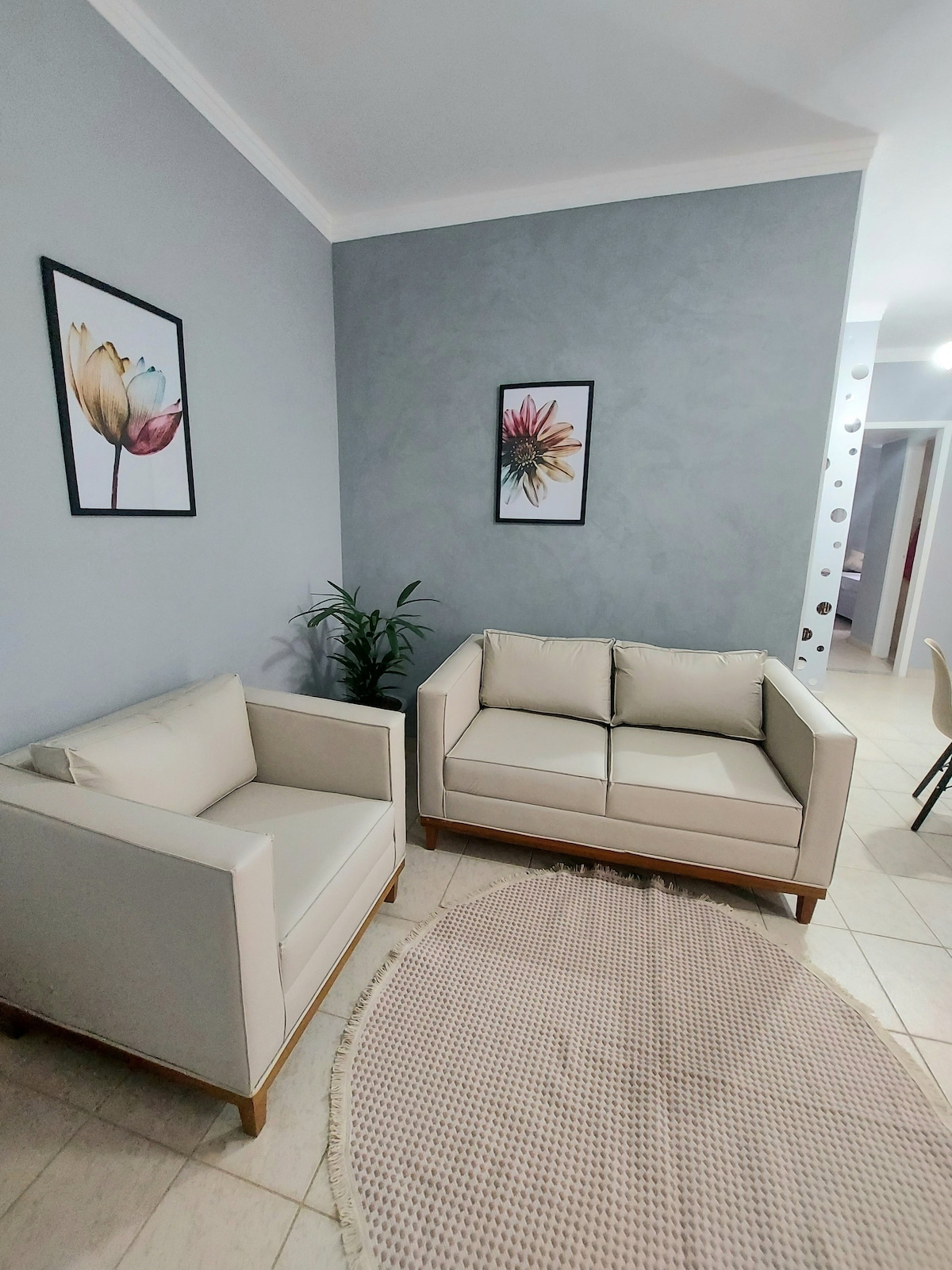 Novíssimo apto aconchegante de 52m2, distante 500 metros da praia, com 2 dormitórios, sala ampla, ar condicionado, internet com Wi-Fi, cozinha completa, sacada com churrasqueira, 2 vagas de garagem privativas, brinquedoteca e piscina compartilhada entre proprietários e hóspedes. A churrasqueira é privativa e tem um grande diferencial, você poderá fazer seu churrasquinho com vista para as montanhas e aproveitando ao máximo desse momento com a família e amigos.