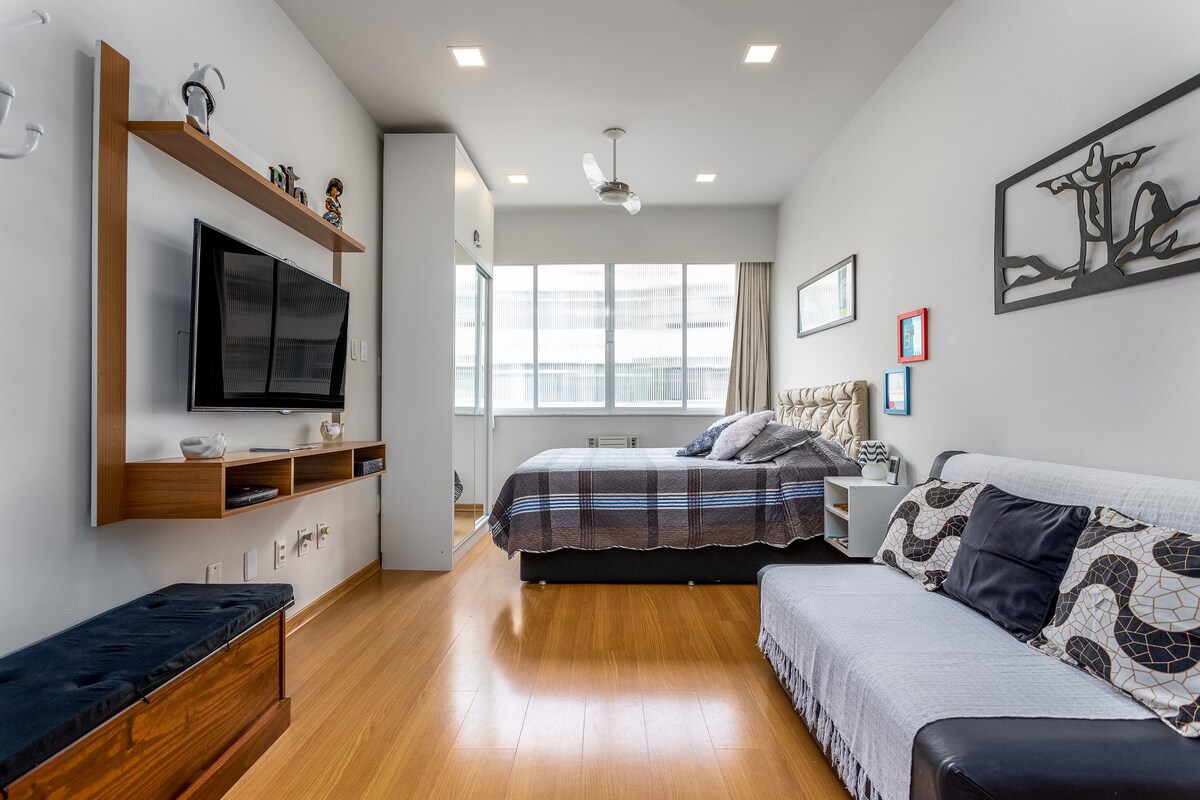 Siente la bossa nova con la brisa del mar en CASA JOBIM, y disfruta de toda la experiencia y comodidad de estar en un apartamento de diseño conceptual en Copacabana, donde la inspiración se encuentra con la belleza de Río de Janeiro. Estamos ubicados en el Real Residence Hotel, que ofrece todas las comodidades para una estancia elegante y agradable. Ofrecemos servicio de limpieza, Wi-Fi de 500 MB, TV por cable, Netflix y aire acondicionado y espacio de coworking a tres cuadras de la playa. Opción de dos camas individuales o una cama queen.