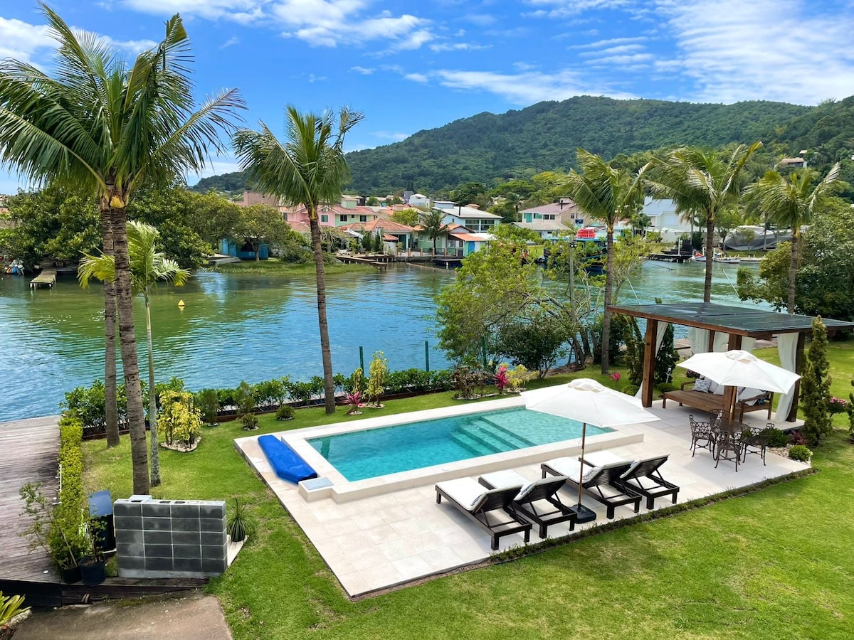 Hermosa casa de 250 m² frente al mar en Ribeirão da Ilha, el barrio más conservado y tradicional de Florianópolis. 3 suites con cama queen, doble, 2 individuales y cuna para bebés. Aire acondicionado frío / calor en todas las habitaciones. Piscina de águas CALIENTES. Gran salón con televisión por cable e internet, espacio gourmet con barbacoa, estufa de leña y horno de pizza. Terreno de 1000 m² con acceso al mar, ideal para kayak (a disposición de los huéspedes). Lugar para el descanso familiar!