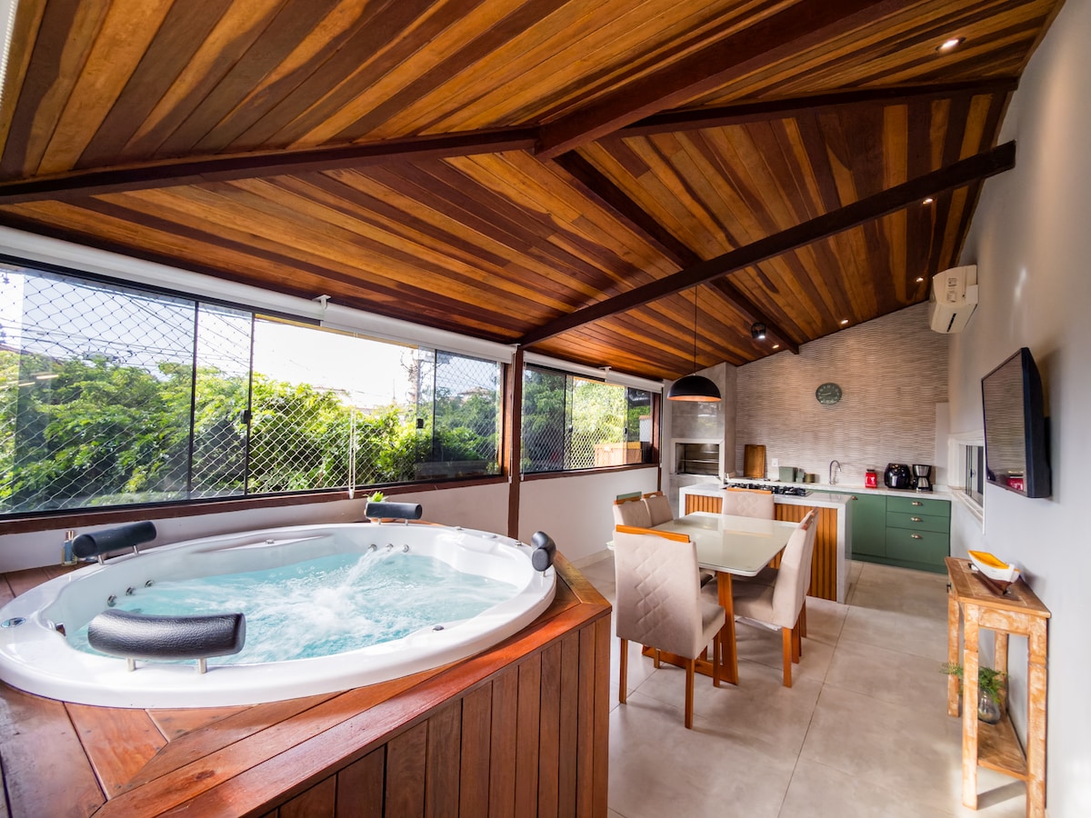 ¡Cobertura espaciosa! Cerca de las principales playas de Búzios y del Centro (Rua das Pedras). Cocina americana de concepto abierto, comedor y sala de estar integrados con TV de pantalla plana de 50", cocina exterior, zona gourmet (zona de barbacoa), terraza amplia y fresca con zona social (sofá, mesas y hamaca). Baño interior y exterior + 1 lavabo. 1 habitación acogedora: cama queen, aire acondicionado y TV por cable. Entrepiso: 1 cama doble, 2 camas individuales, 1 sofá cama, aire acondicionado, TV y lavabo.
