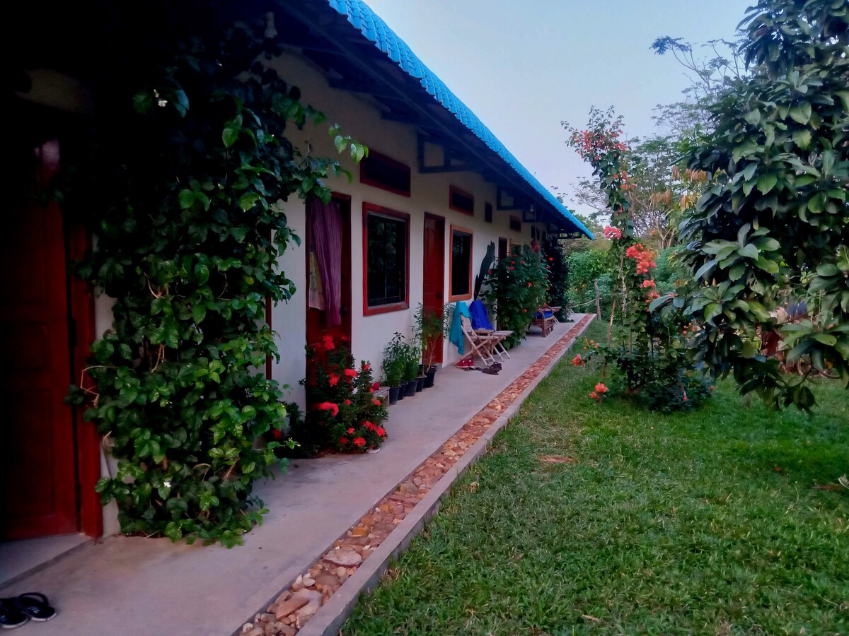 Disfrute de la vida en una isla en esta habitación doble con baño de nueva construcción. Los techos altos agregan espacio para el flujo de aire fresco, la cama doble, el ventilador de techo y un amplio baño lo permiten para una estancia cómoda. Los lugareños y los expatriados conforman esta comunidad amistosa y la naturaleza circundante, separada de la playa, ofrece una brisa fresca y acceso a los arrecifes de esnórquel.