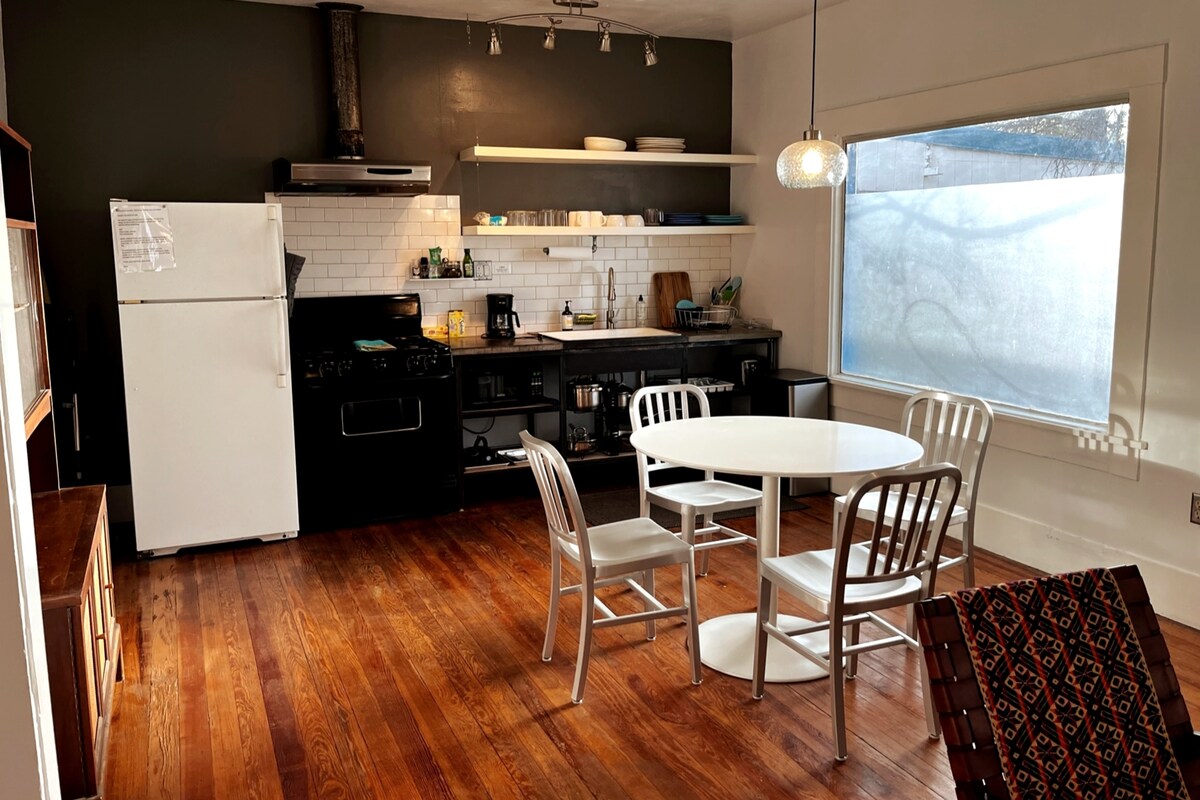 El minimalismo se une a la elegancia ecléctica. Totalmente equipado para la comodidad, pero ligeramente decorado para un aspecto abierto, luminoso y limpio. Paredes blancas frescas y suelos antiguos de pino de hoja larga con un plano de planta abierta, además de accesorios antiguos, muebles vintage y fabricados localmente, y arte de segunda mano. ¡En el centro de Marfa y a poca distancia a pie de casi todas partes! No se admiten mascotas. Sin excepciones. Lo sentimos, no funciona para esta propiedad.