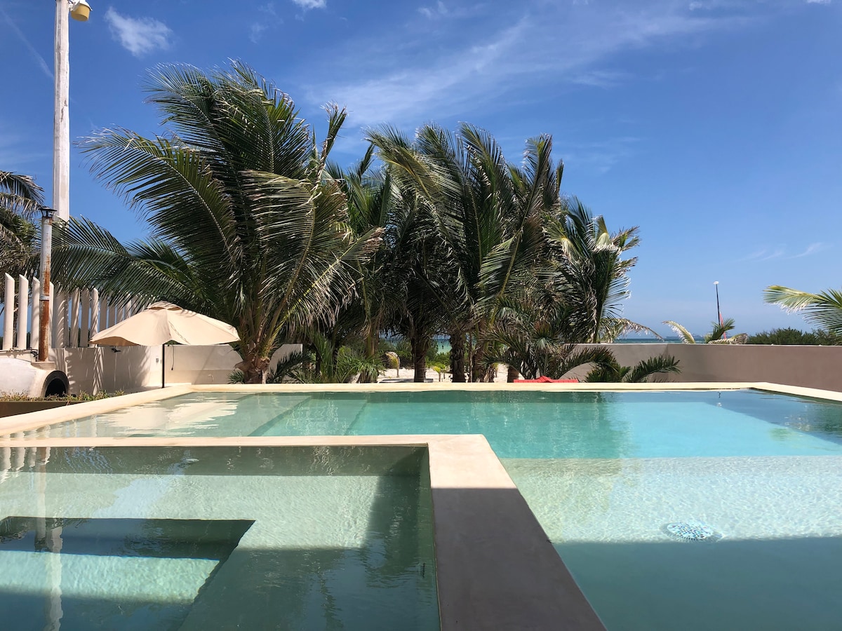 Depa con espectacular vista al mar! A pocos minutos de Mérida. El edificio cuenta con una enorme piscina y acceso directo a la playa. Los muebles son cómodos, la cocina y las habitaciones están bien equipadas y todo funciona perfectamente. Además, el departamento dispone de agua caliente y presurizada y acceso a internet de alta velocidad (80 mbps). Combina lo mejor del mar con todas las comodidades de la ciudad en este lugar ideal para relajarse frente al mar.