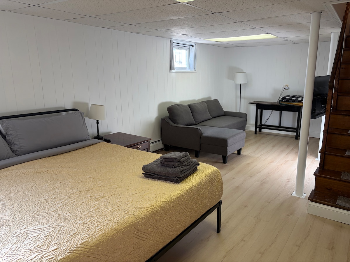 Ubicación privilegiada en la cima de la colina, entre el centro de Newport y la (primera) playa de Easton. ¡Corre por el Cliff Walk, a 3 cuadras de distancia! Este estudio privado y abierto cuenta con una cómoda cama king de espuma viscoelástica, un baño nuevo, una cocina pequeña (con microondas y refrigerador, sin horno) y un sofá grande para estirarse. Ideal para una pareja que busca escaparse a un lugar un poco más hogareño que un hotel. Tiene estacionamiento. También es adecuado para padres y niños pequeños. NOTA: En marzo de 2026, el patio delantero está lleno de barro debido a las obras, precio reducido.😊NPT ID#755