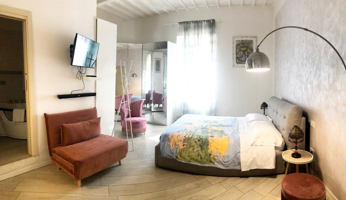 La suite Miguel Ángel King se encuentra en el corazón del Centro Histórico de Arezzo, dentro de la parte medieval de la torre llamada "La Corte del Re". El alojamiento consta de una entrada con cocina americana, comedor, baño con ducha y cama doble, bajo petición el sofá se transforma en una cama doble. Todas las comodidades de un hotel en la comodidad, libertad y privacidad de tu habitación, con acabados finos y frescos, con una vista frontal de la magnífica Piazza Grande.