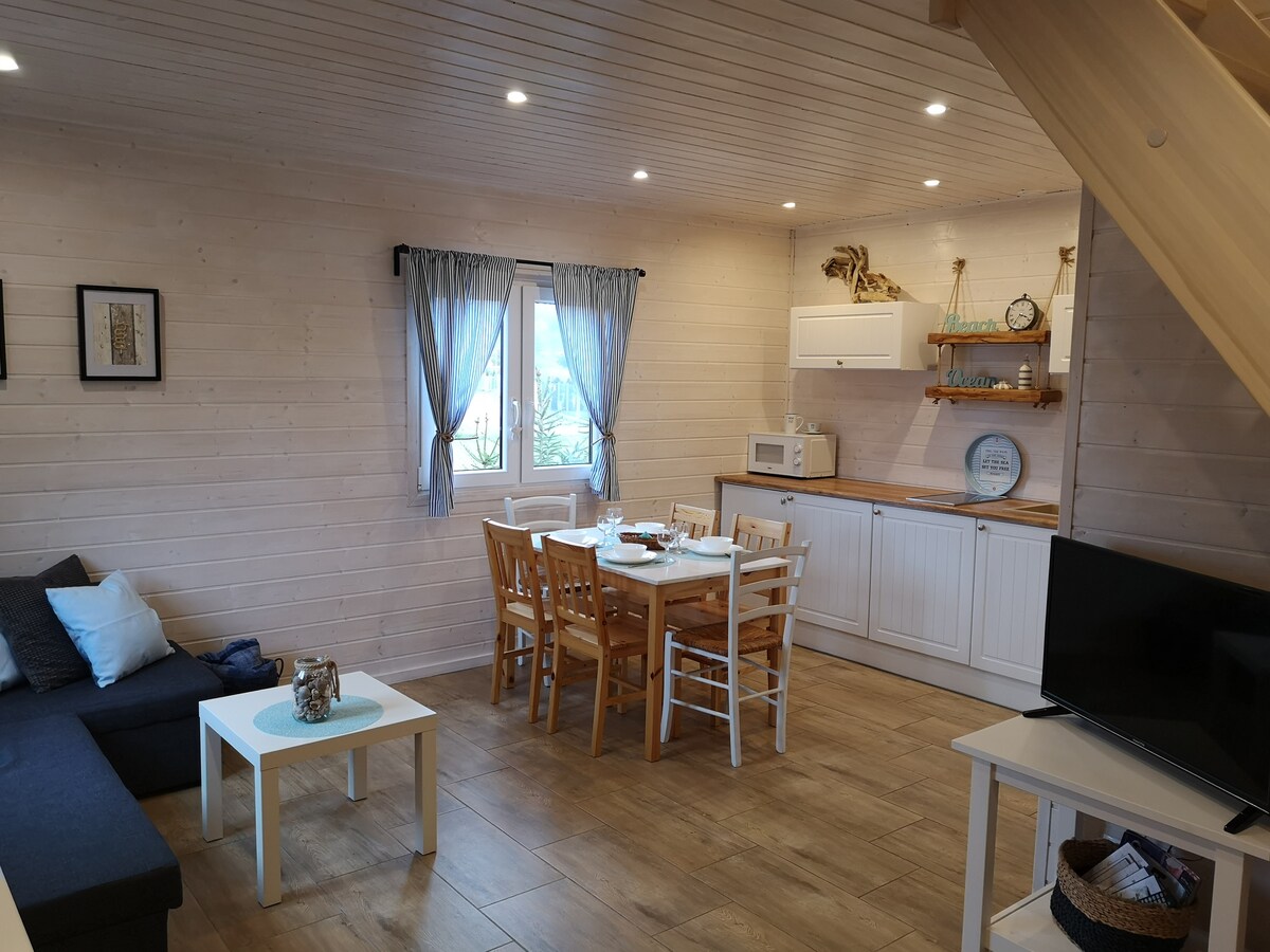 Disfruta del hermoso entorno de este romántico lugar en la naturaleza. Zona MiniSpa - Acceso ilimitado a la sauna finlandesa. - sesión privada en una bañera de hidromasaje de leña (cargo adicional) - barril de recolección de alimentos Casa de campo Premium de 36 m2 - Cocina totalmente equipada. - lavavajillas - aire acondicionado con función de calefacción - Cama tamaño king en el dormitorio. - Rincón plegable en la sala de estar ( 140x200) - diseño moderno - Jardín privado ( separado por vegetación)