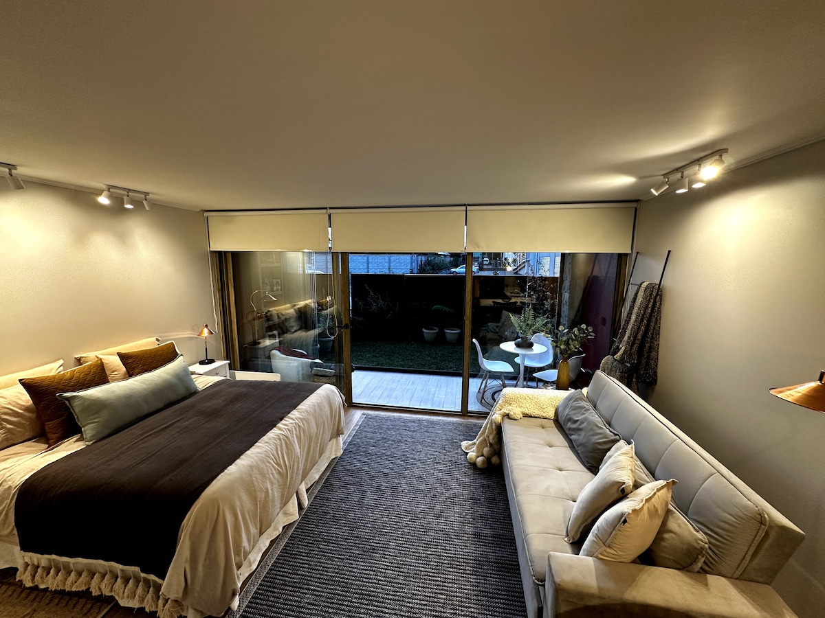 Nuevo y acogedor estudio en la mejor ubicación de Pucón, a pasos de playa grande, centro, y aislado del ruido de la calle principal. Cuenta con cama de 2 plazas, un futón de 2 plazas, cocina full equipada, baño completo, WiFi, TV 49" con Netflix, Disney+ y más, terraza, calefacción, parrilla, cafeteras, 2 bicicletas de uso ilimitado, entre otros. Estacionamiento público frente al acceso al edificio disponible. Incluye ropa de cama, toallas, e insumos básicos de baño y cocina para cada estadía.