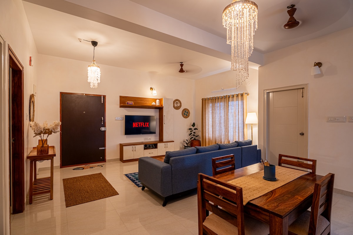¡Te damos la bienvenida a nuestro apartamento Lakeview! Experimenta la comodidad moderna en el entorno sereno de Bangalore. Relájate en nuestro acogedor apartamento de 2 dormitorios con aire acondicionado (en un dormitorio). Disfruta de una transmisión fluida con wifi de 100 Mbps. Disfruta de la comodidad de tener aparcamiento gratuito disponible dentro de las instalaciones, lo que hará que tus desplazamientos sean muy sencillos. Disfruta de té y café de cortesía y descansa en colchones premium con sábanas de calidad. Se proporcionan champú y gel corporal para una estancia sin preocupaciones. ¡Disfruta de la comodidad y la conveniencia en su máximo esplendor!