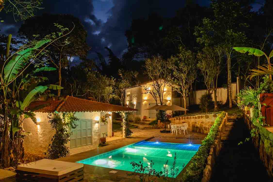 Spacious cabin for up to 8 guests in Puente Nacional. It has 2 bedrooms with private bathrooms, a social bathroom, and an extra shower by the pool. Includes 4 double beds, Wi-Fi, TV, kitchen with propane grill, and covered social area. Guests enjoy a private 7×4×1.2 m pool, showers with hot water, parking, and gated community. As part of Leyva Coffee Stay, visit Finca Casa Blanca for an authentic coffee experience. Short drive from Villa de Leyva and Ráquira.