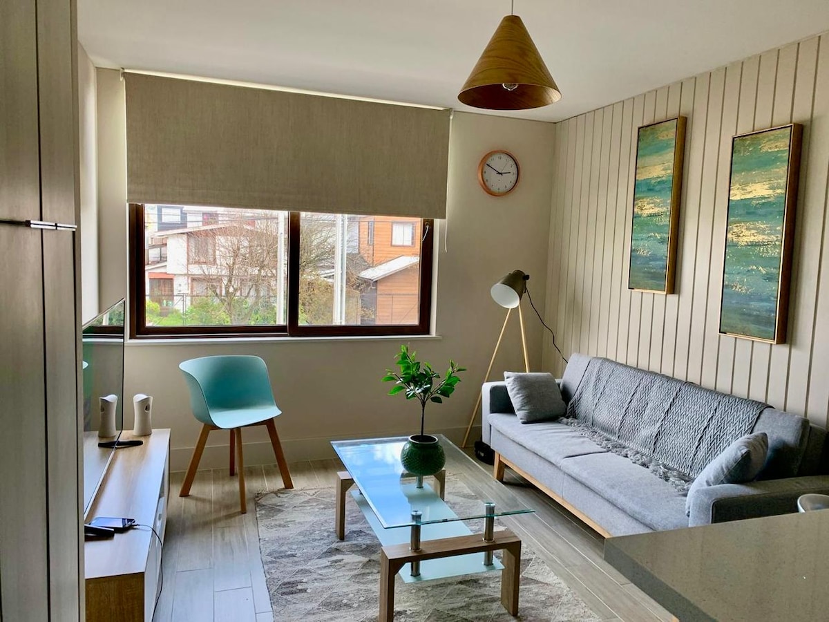 Monoambiente con muy buena ubicación, emplazado en barrio tranquilo cercano a locomoción colectiva y comercio. Se encuentra en 1er piso, cuenta con cama matrimonial premium y sábanas de 200 Hilos; además contamos con desayunador equipado con horno eléctrico, frigobar, hervidor, lavaplatos y juego de lozas. Incluye Smart TV y Wi-FI. Baño en suite equipado con Shower. Nuestro sistema de calefacción ofrece una temperatura uniforme y amigable con el medio ambiente. Estacionamiento gratuito.