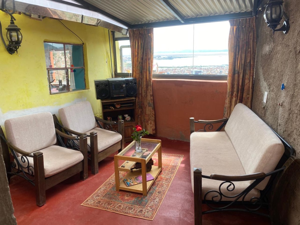 Lindo mini departamento con entrada independiente sala comedor TV y Netflix cocina que cuenta con lo necesario,wifi de alta velocidad . Recojo en auto gratuito del terminal terrestre o zonal en Puno. Realizamos recojo en aeropuerto de Juliaca con un costo adicional.