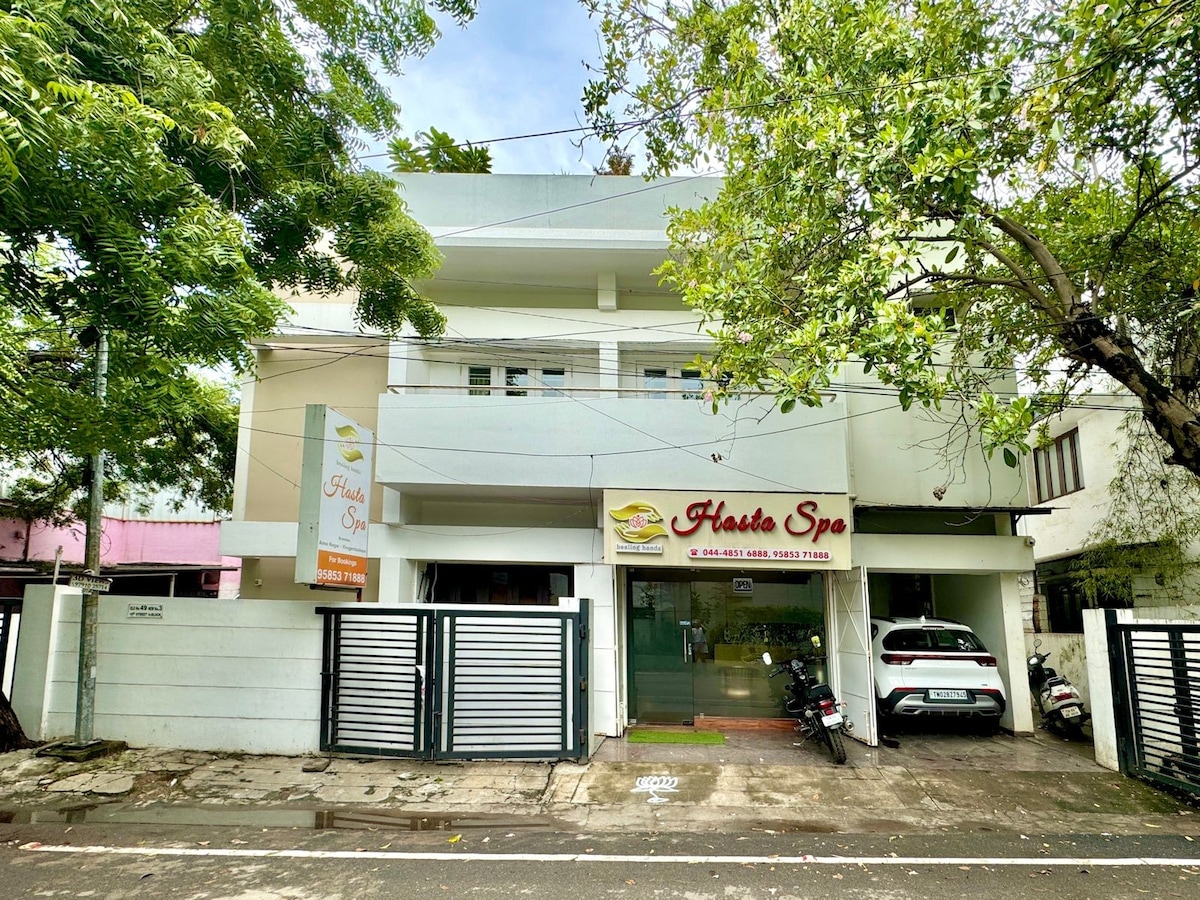 ¡Empápate del corazón de Chennai! Este hermoso apartamento de 3 dormitorios ofrece comodidad y ubicación privilegiada. Tu familia estará cerca de todo cuando te hospedes en este lugar céntrico. La estación de metro Egmore está a solo 8 minutos a pie y a 10 minutos en coche de la estación central. La propiedad puede alojar cómodamente a 6+2 huéspedes. Nuestra cocina está equipada con utensilios y utensilios de cocina básicos. Tenemos aire acondicionado en todas las habitaciones, estacionamiento gratuito, wifi, purificador de agua y respaldo de energía de hasta 5 horas (excluyendo el aire acondicionado).