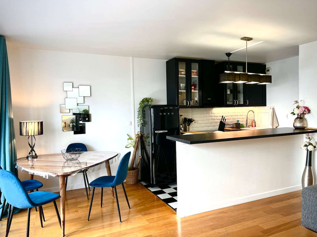 Apartamento renovado con magnífica vista despejada a la Torre Eiffel y amplio balcón: ideal para tomar el sol o cenar al aire libre. Cerca de todos los comercios y del transporte público: 2 minutos a pie de la estación Puteaux (a 10 minutos del Arco del Triunfo y a 20 minutos de Châtelet). Ubicación ideal para eventos en la Arena La Défense (a 20 minutos a pie). Habitación con cama doble. Salón con sofá y comedor. Cocina americana, baño con tina y WC independiente. Parqueadero privado gratis.