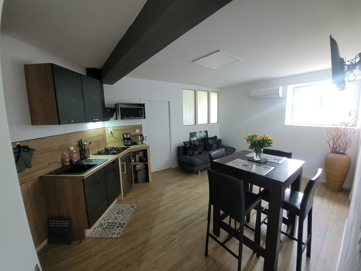 Estudio cálido y acogedor totalmente equipado con acceso independiente a nivel de calle, situado en una casa de arquitecto y en una zona residencial muy tranquila. Tendrá una terraza amueblada independiente y una plaza de aparcamiento en un lugar cerrado. Préstamo de bicicleta bajo petición. ¡La ubicación tranquila, a 5 minutos en coche o a 30 minutos a pie del centro histórico lo convierte en una verdadera ventaja! Nuestro alojamiento, clasificado 3★ en amueblado turístico, es una verdadera garantía de calidad y comodidad.