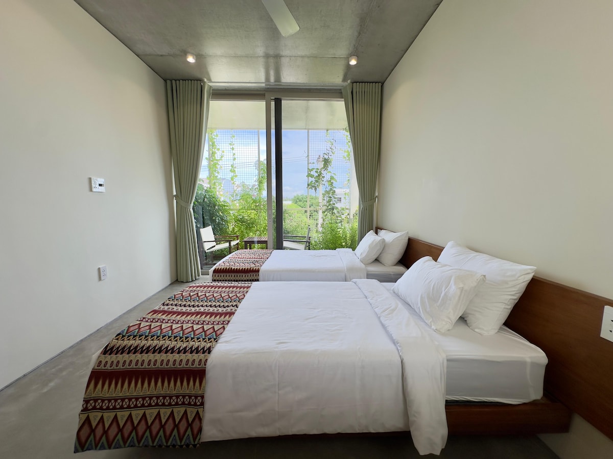 # Room 102 – 1st Floor with Pool & Garden Views # Private balcony room overlooking the villa’s pool and tropical garden, located beside a stream in Cẩm Thanh. Includes: - Free daily breakfast - Complimentary 4-seat car transfer from Da Nang Airport/Train Station (stays of 15+ nights) - 3 km to Hội An Ancient Town | 5 km to An Bang Beach | 2km to Bay Mau Coconut Forest | Bà Lê Marketplace 1km