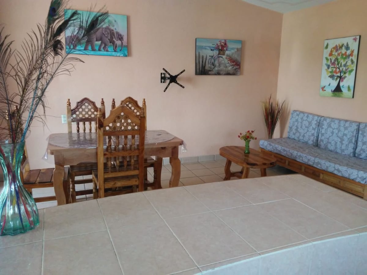 Departamento ubicado en 2do piso, se tienen que subir escaleras, habitaciones con ventilador, espacio de sala con ventilador, baño, vigilancia via CCTV 4 camaras en exteriores, Internet basico, servicio de Smart tv roku en sala y recamara principal, cocineta con barra y 2 bancos altos y refrigerador con dispensador de agua fria