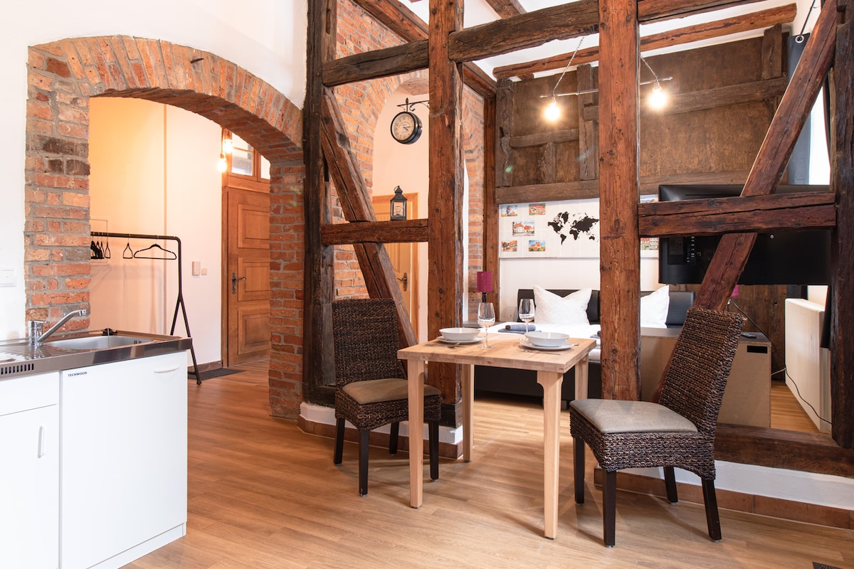 El estudio hogareño de "Das Kutscherhäuschen" cuenta con suelos de madera, muebles de madera maciza e iluminación suave. Cuenta con TV de pantalla plana con canales vía satélite, zona de estar y terraza. La cocina pequeña está bien equipada para preparar comidas caseras. También puedes encontrar varios restaurantes y cafés a 10 minutos a pie. El estudio cálidamente decorado ofrece wifi gratuito, una pequeña cocina y un televisor de pantalla plana con canales vía satélite.