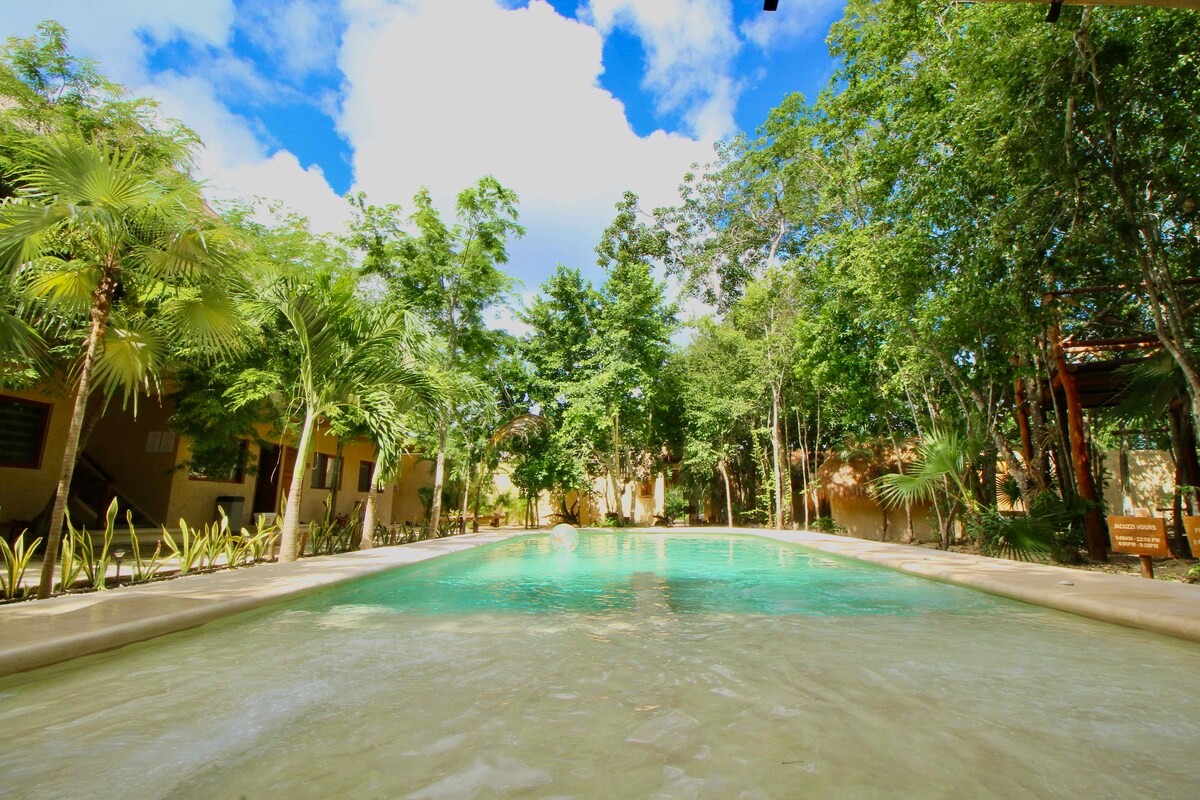 Encantadora y privada habitación King en Tulum ♡ • Restaurante mejor valorado en el lugar Aroma Cafe Tulum. • Piscina estilo cenote con chorros de masaje. • Check-in sin restricción de horario después de las 3:00 p. m. • Hora de salida: 11:00a.m. • Internet de fibra de 1000 Mbps. • Aire acondicionado completo • 1 cama tamaño king. • Televisión inteligente 4K de 42 pulgadas con satélite y Netflix • Baño privado en suite • Frigorífico, microondas y cafetera. • Estacionamiento privado gratuito • Parrilla exterior. • Exclusivamente para 2 adultos o 1 adulto y 1 niño.