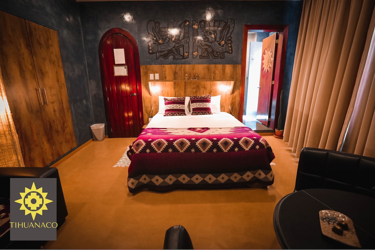 🏡 Habitación Matrimonial en Chakana Centro Acogedora y cómoda, ideal para 2 personas 🛏️. Decorada con inspiración en la cosmovisión andina 🌄, celebramos las fiestas tradicionales, solsticios y equinoccios. La habitación cuenta con baño privado y desayuno incluido 🥐. Ubicada cerca de los centros ceremoniales de Quito, permite disfrutar de fogatas en el patio interior y del ambiente del restaurante Uku Pacha Café-Restaurante 🍽️ en el primer piso.