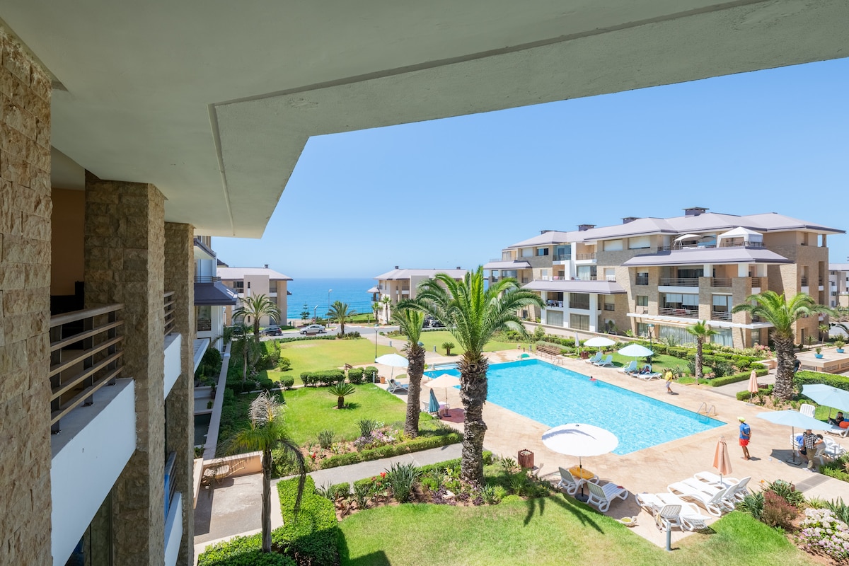 Superbe appartement vue sur mer haut standing, 2eme Étg Immeuble neuf dans une résidence fermé en bord de mer, 2 Cham, Double Salon, Coin feu 2 SDB et une belle terrasse donnant sur la mer. Meublé avec goût et place de parking attribué. Espace jeux pr enfants. Possibilité de surfer toute l année, site et école de surf ( l un des meilleurs spots de la régions ) se trouvant à 5 min du site et golf 18 trois neuf à 5 min du site dispose également d un practice / parcours 18 trous et club House.