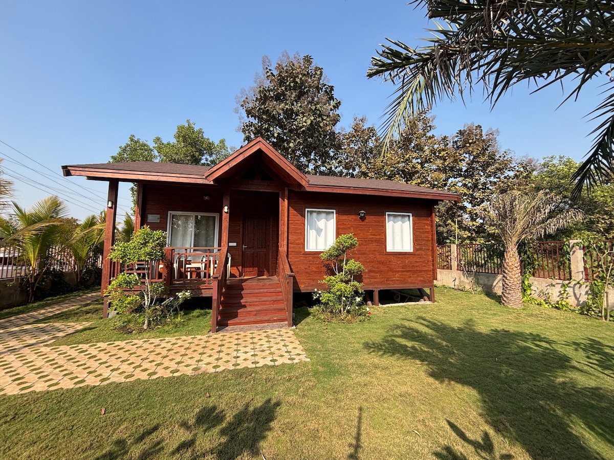 Esta hermosa casa de madera de un dormitorio, hecha de pino canadiense importado, ubicada cerca del aeropuerto en VIP Road en Raipur, la capital de Chhattisgarh, ofrece la experiencia de estar en Canadá o Suiza. Cuenta con una magnífica piscina y un jardín para fiestas. Esta hermosa casa de madera cerca de la ciudad te hace sentir lejos de la ciudad.