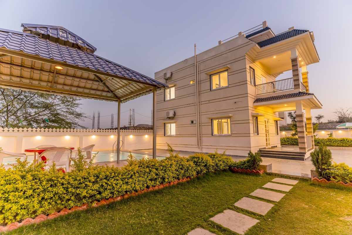 Relájate con toda la familia en este lugar tranquilo para hospedarte. Villa de lujo 4Bhk con piscina privada, cocina totalmente equipada con vistas muy bonitas de las colinas de Aravalli. La propiedad es nueva y está situada cerca de las colinas de la selva chirwa . El bosque phoolo ki ghati, donde la aventura en tirolina está disponible a solo 1 minuto en auto , el templo Eklingji, el templo Shahashtrabahu y el templo Vaishnav devi están a solo 5 minutos en auto y el templo Shrinathji está a 20 minutos en auto de nuestra propiedad y muchas más belleza natural.