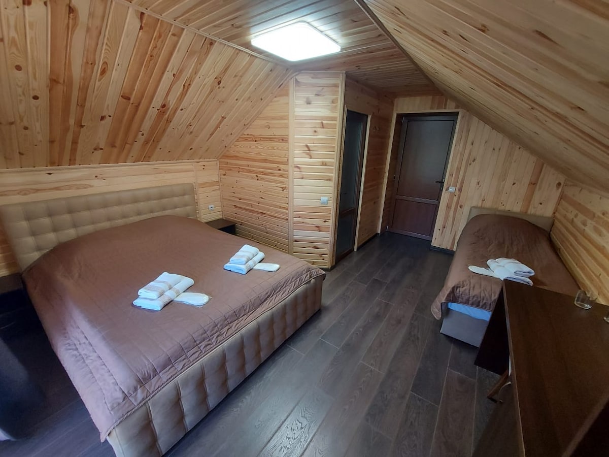 Новий тримісний номер має власний балкон з чудовим видом. У номері є велике двоспальне і односпальне ліжко, власна ванна кімната. плазмовий телевізор, якісне покриття інтернету і надається безплатна стоянка для авто. Також гості мають доступ до спільної кухні на якій можуть самостійно готувати. На відстані 40 метрів є кафе де наші гості замовляють сніданки. В 150 метрах від нас є лижний спуск R1.