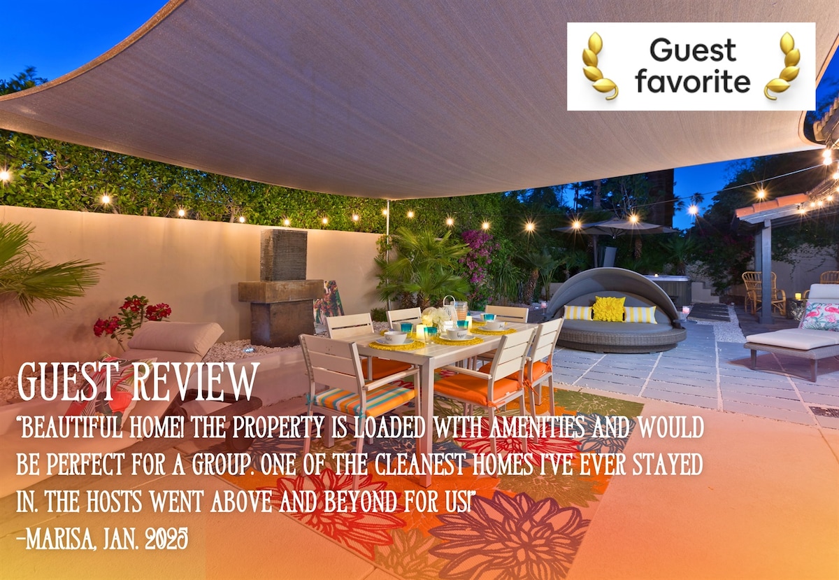 Disfruta del sol californiano con un tranquilo baño en la piscina privada y el spa. Disfruta de una barbacoa o relájate al aire libre en más de medio acre en este espacioso refugio. Juega Cornhole, relájate en las cabañas, en las tumbonas junto a la chimenea o en el sofá al aire libre. No te debes perder las hermosas vistas a la montaña. Número de identificación de la ciudad de Palm Springs # 4059 Calefacción de la piscina y el spa si es necesario 50 $ al día. Spa solo $25 por día * Alquiler de largo alcance Tesla Model 3, incluye carga S1 gratuita en la casa. Comunícate con Brandi para consultar la disponibilidad.