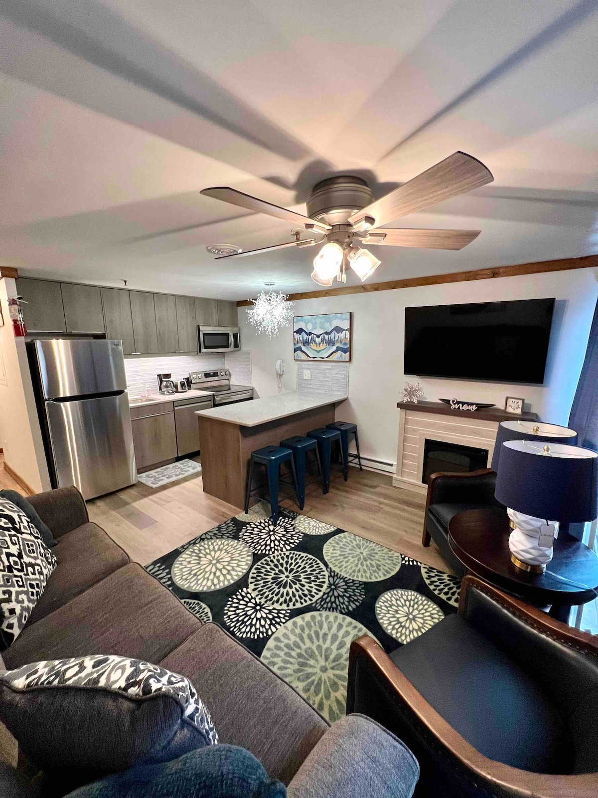La mejor ubicación en Snowshoe en el recientemente renovado Mountain Lodge (a partir de 2025), ¡a solo unos pasos del ascensor Ballhooter! Decoración moderna, nueva terraza, pisos de madera, cocina abierta renovada y sala de estar; ¡vista al ascensor, al pueblo y a la pendiente! Almacenamiento de esquís y botas en el condominio ¡Incluye café y cacao! Capacidad para 4 personas, cama tamaño queen y sofá cama. 15 % de descuento en el alquiler de esquís Estacionamiento gratuito PLATO Nuevos televisores inteligentes Wi-Fi mejorado Aire acondicionado en LR en verano Juegos Gimnasio nuevo Nintendo clásica